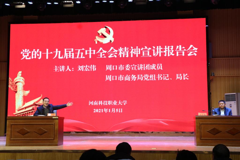 以实干开启新征程,用奋斗创造新伟业,为学习贯彻落实党的十九届五中全会精神,深刻领会全会重大意义,准确把握全会精神实质和丰富内涵,2021年1月5日下午,我校在图书馆三楼报告厅举行了党的十九届五中全会精神宣讲报告会。周口市委宣讲团成员、周口市商务局党组书记、局长刘宏伟作宣讲报告。我校党委书记王剑、党建指导员司元亨、纪委书记凌现庄、党委学工部长尚德山、党委组织部长门立志、校委会委员、财务处长赵艳杰、党委委员孙天兴、党办主任王西之出席会议。各院部党政领导班子、处室负责人、思政课教师、辅导员、师生党员、校院两级主要团学干部等600余人参与会议。会议由王剑书记主持。