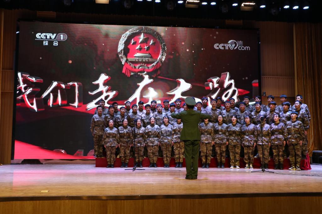汽车工程学院的学生们身着军装庄严且肃立,声音嘹亮的唱着《我们走在大路上》,红旗在手,理想在胸,对社会主义前程的无限美好和自己身为中国人而感到无比自豪。