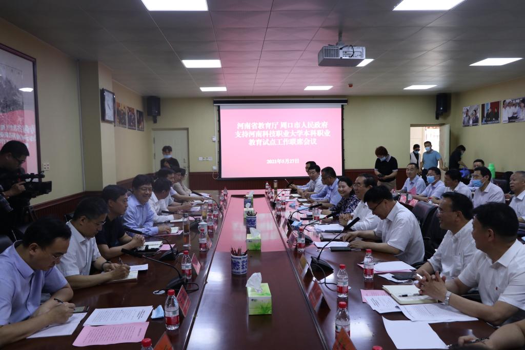 5月27日下午,省教育厅党组书记、厅长郑邦山,教育厅党组成员、副厅长陈垠亭,教育厅办公室主任张国强,政策法规处处长徐军保,人事处处长杨光,发展规划处处长宋振,财务处处长王鹏,职成教处处长秦剑臣,高教处处长张水潮,职成教处副处长任远等莅临我校指导职业教育试点工作,周口市委副书记、市长丁福浩,副市长梁建松,周口市政协副主席、我校理事长李海燕,党委书记王剑及周口市政府办公室、市教育体育局、发改委、人社局、财政局、编办、住建局等部门的负责同志陪同。我校在综合实训中心一楼会议室召开河南省教育厅和周口市人民政府关于本科职业教育试点工作联席办公会,会议由梁建松主持。