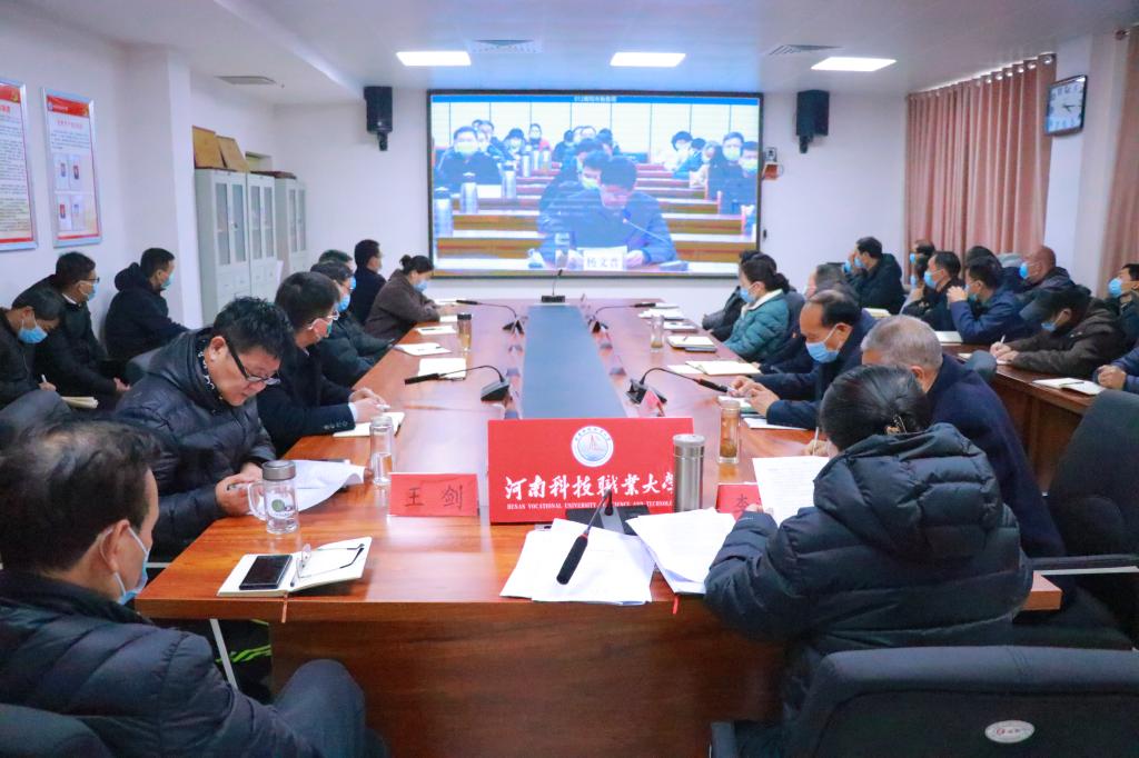 3月20日下午,省教育厅召开全省教育系统疫情防控工作视频调度会议,就当前疫情防控工作进行再安排部署。我校在综合楼12楼会议室设置分会场,周口市政协副主席、学校校长李海燕,党委书记王剑,党委副书记司元亨,常务副校长马金岭,副校长许德宽,党委副书记夏永亮,纪委书记凌现庄,副校长艾旭光及各相关单位负责人集中收听收看会议。