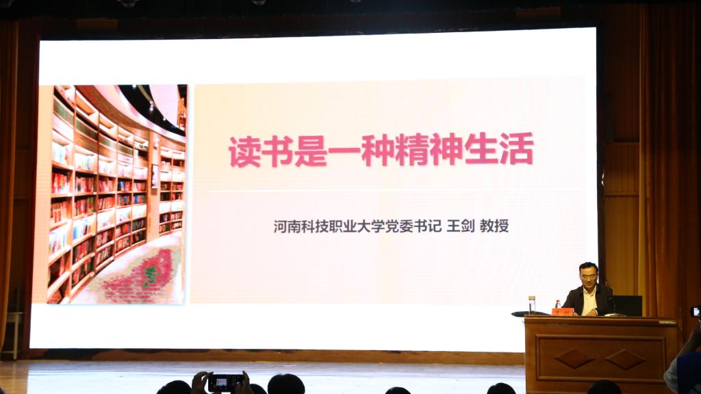 河南科技职业大学王剑教授做《读书是一种精神生活》专题讲座。他首先从身边出发,以职业教育的问题和教育的目的,引出讲座的核心观点:读书是对一个人的精神考验和心灵净化。以“读书是一种精神生活”“读书与人的精神成长”作为分论点论述,并以契柯夫《打赌》、马克思、朱熹等名人著作为论据。