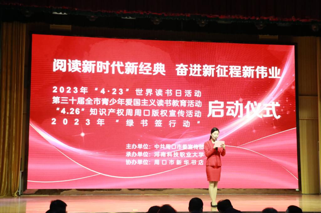 4月21日下午,中共周口市委宣传部主办,河南科技职业大学承办,周口市新华书店协办的2023年“4·23”世界读书日活动,第三十届全市青少年爱国主义读书教育活动,“4.26”知识产权周周口版权宣传活动,2023年“绿书签行动”启动仪式在河南科技职业大学图书馆三楼报告厅举行。市委常委宣传部长王少青,河南科技职业大学校长李海燕,党委书记王剑出席活动。市直及驻周各相关单位分管负责人,川汇区委分管负责人,市城乡一体化示范区、周口临港开发区、党工委分管负责人,中小学优秀导读员代表,河南科技职业大学师生代表参与活动。活动由杜莹莹主持。