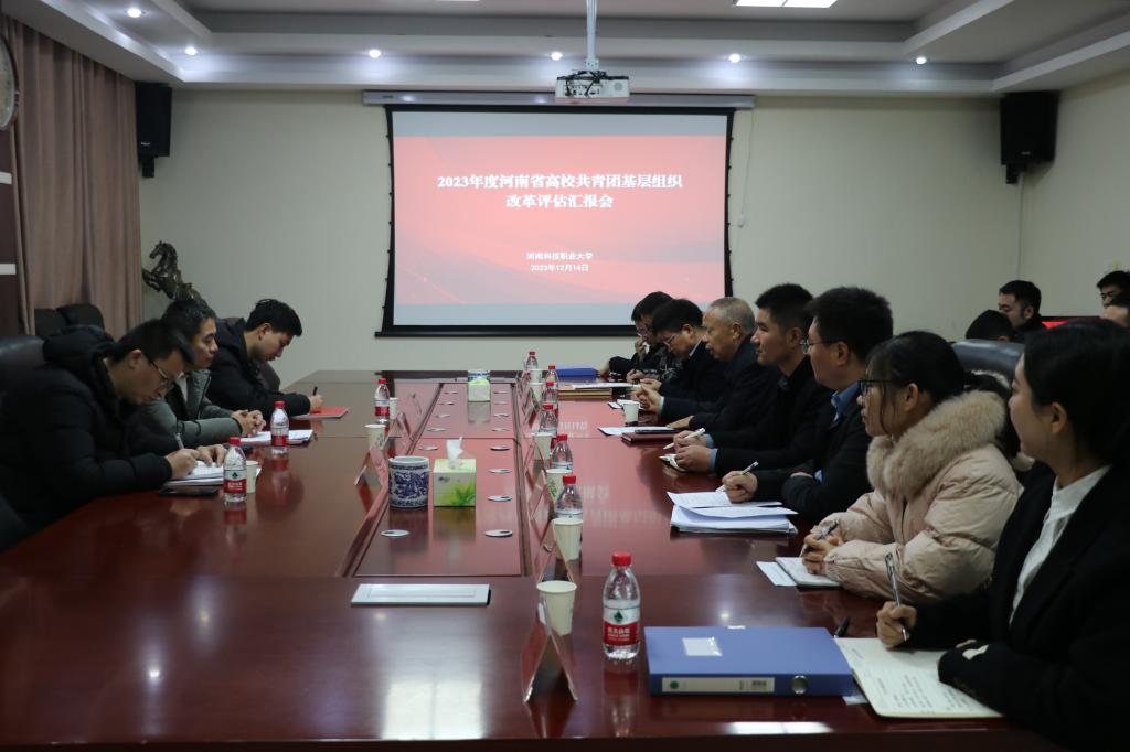 12月14日,共青团河南省委第五评估复核组河南师范大学校团委副书记杨上上,法学院团委书记陈宇翔,新联学院团委书记李震南一行3人莅临我校开展2023年河南省高校共青团基层组织改革评估工作。我校在综合楼9楼会议室召开汇报会,党委副书记司元亨、夏永亮,周口师范学院团委副书记张少辉、周口职业技术学院团委书记闻檑、周口文理职业学院团委书记王东伟及团委各部门负责人参加会议。会议由司元亨主持。