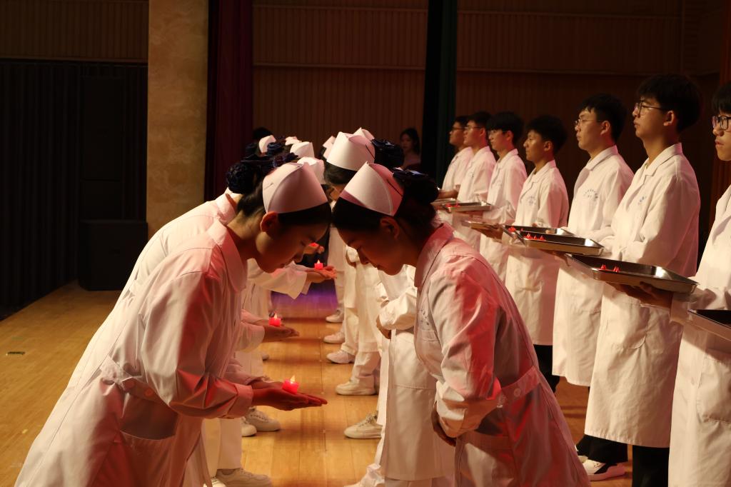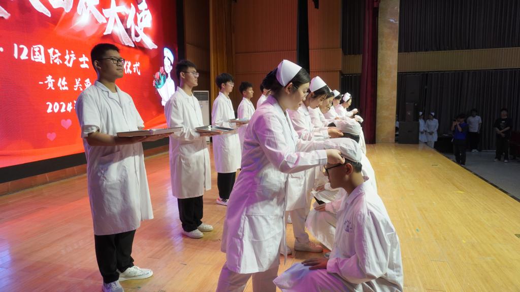 在唯美悠扬的音乐声中,184名身着洁白护士服的护士生代表依次缓缓走上台阶,单膝着地,由护理行业前辈亲手为他们戴上象征圣洁天使的洁白燕尾帽,并将象征南丁格尔精神的蜡烛传递给他们。