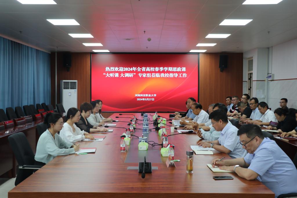 5月27日上午,由华北水利水电大学马克思主义学院院长张梅任组长,华北水利水电大学马院思想道德与法治教研室主任余佳莹,漯河食品职业学院马院院长王含,河南应用技术职业学院马院教师刘晓婉、华北水利水电大学马院教师朱赛为成员的全省高校春季学期思政课“大听课 大调研”专家组一行5人莅临我校开展思政课“大听课 大调研”工作。调研汇报会在我校综合教学中心8楼会议室召开。我校党委书记苏宇,副校长许德宽,党委副书记夏永亮,纪委书记凌现庄,副校长师鹏,马院院长刘灜纪,各学院(部)党组织书记、相关处室负责人、马院教师代表等参加汇报会。会议由夏永亮主持。