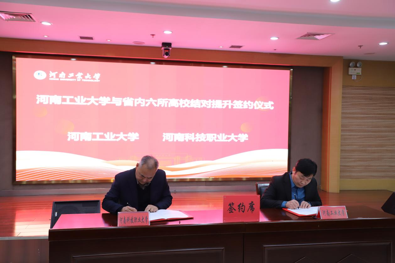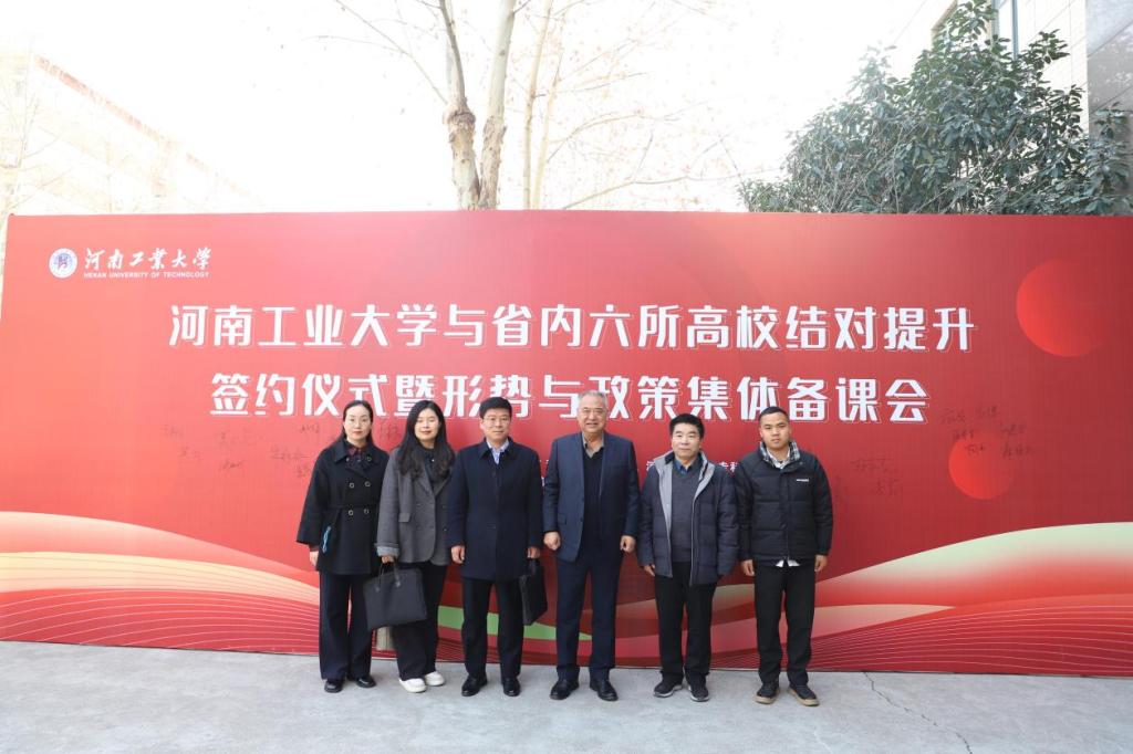 为深入贯彻习近平总书记关于思政课建设的重要指示批示和党的二十届三中全会精神,充分发挥重点、示范性马克思主义学院的示范引领和辐射带动作用,根据省委宣传部、省委教育工委、省教育厅《关于印发<河南省高校马克思主义学院结对提升工作方案>的通知》的要求,进一步推进马克思主义学院发展和思政课教学改革建设,2月27日上午,在河南工业大学大礼堂,我校与河南工业大学举行马克思主义学院结对共建签约仪式。校党委副书记夏永亮,马克思主义学院院长徐金安、党总支书记朱冰冰、副院长张西成、副院长魏华、办公室主任冯春光出席签约仪式。