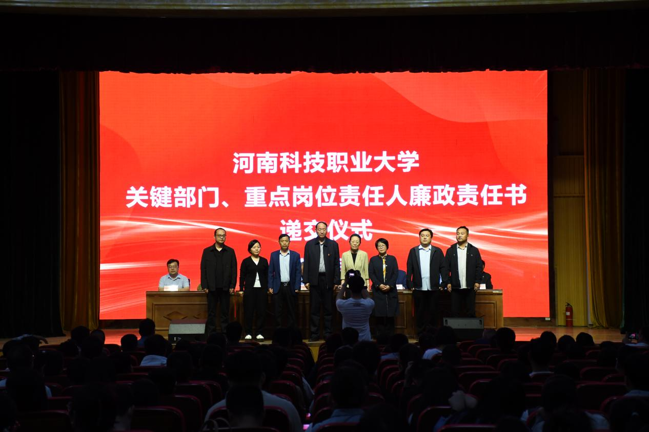 在重点部门、关键岗位责任人向学校递交廉洁承诺书环节,财务处处长赵艳杰、招生就业处处长张冬梅、后勤处处长朱良勇、人事处处长孟丽平、科技处处长苏霄、基建处处长王曙光、水电科科长孔卫蒙等同志上台签署并递交了承诺书。