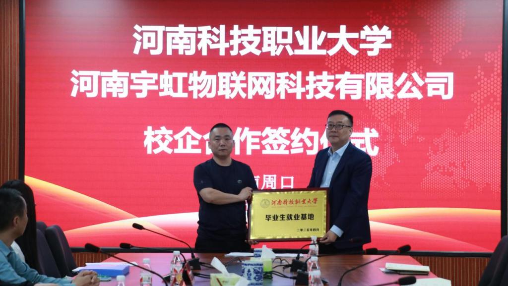 在授牌环节,师鹏为河南宇虹科技物联网有限公司授予 “河南科技职业大学校外实习实训及就业基地” 牌匾,张山恩上台接牌。