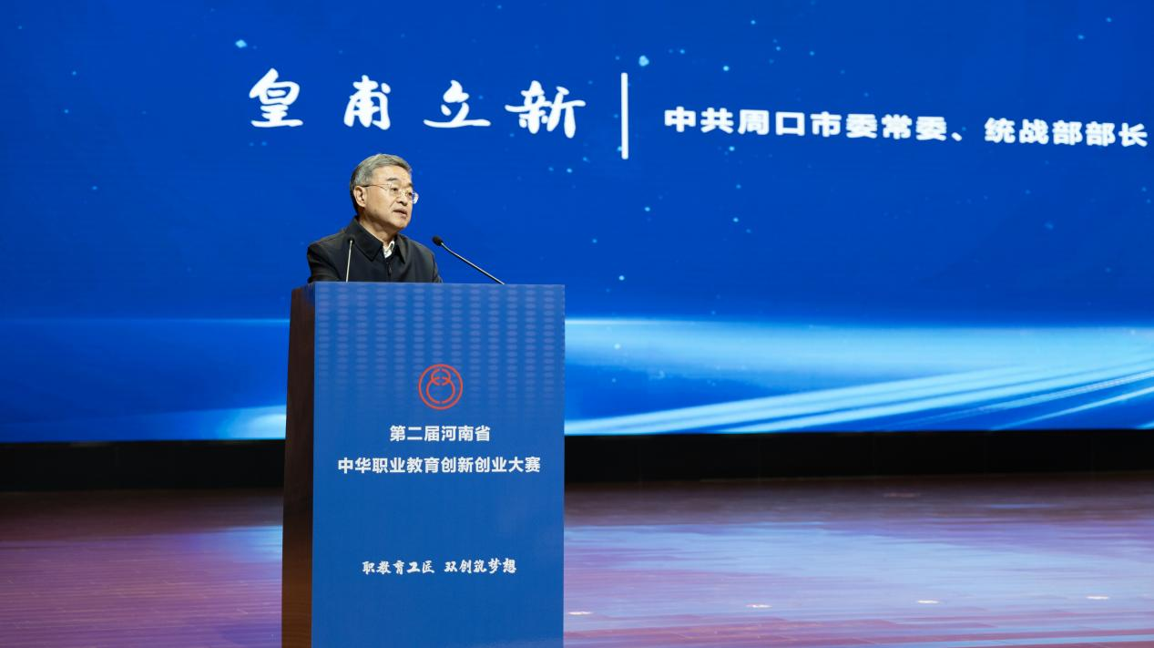 中共周口市委常委、统战部部长皇甫立新代表市委市政府致辞,介绍了周口构建现代职业教育体系的进展。全市5所高职院校、2所技师学院与35所中职学校错位发展,年输送技能人才超3万人,未来将进一步深化校企合作、产教融合,为技能人才创新创业营造更优质的环境。