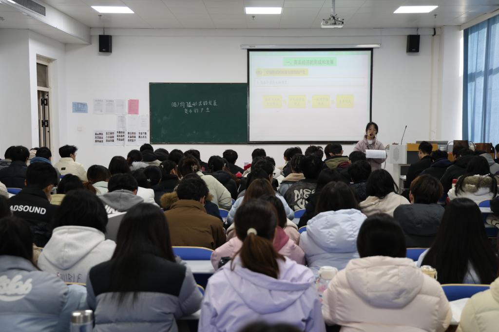 本次课程,郭帅花围绕“价值形式的发展和货币的产生”这一核心内容展开教学。以商品交换的历史演进为线索,从简单的、偶然的价值形式出发,系统梳理了总和的、扩大的价值形式,再到一般价值形式,直至货币形式的产生过程。课堂上采用历史案例与课堂讨论相结合的方式,将抽象的经济学理论转化为生动具体的知识图谱,引导学生深刻理解货币作为固定充当一般等价物的商品这一本质,及其在商品经济中扮演的关键角色。课堂逻辑严谨、讲述清晰,师生互动频繁,气氛热烈。