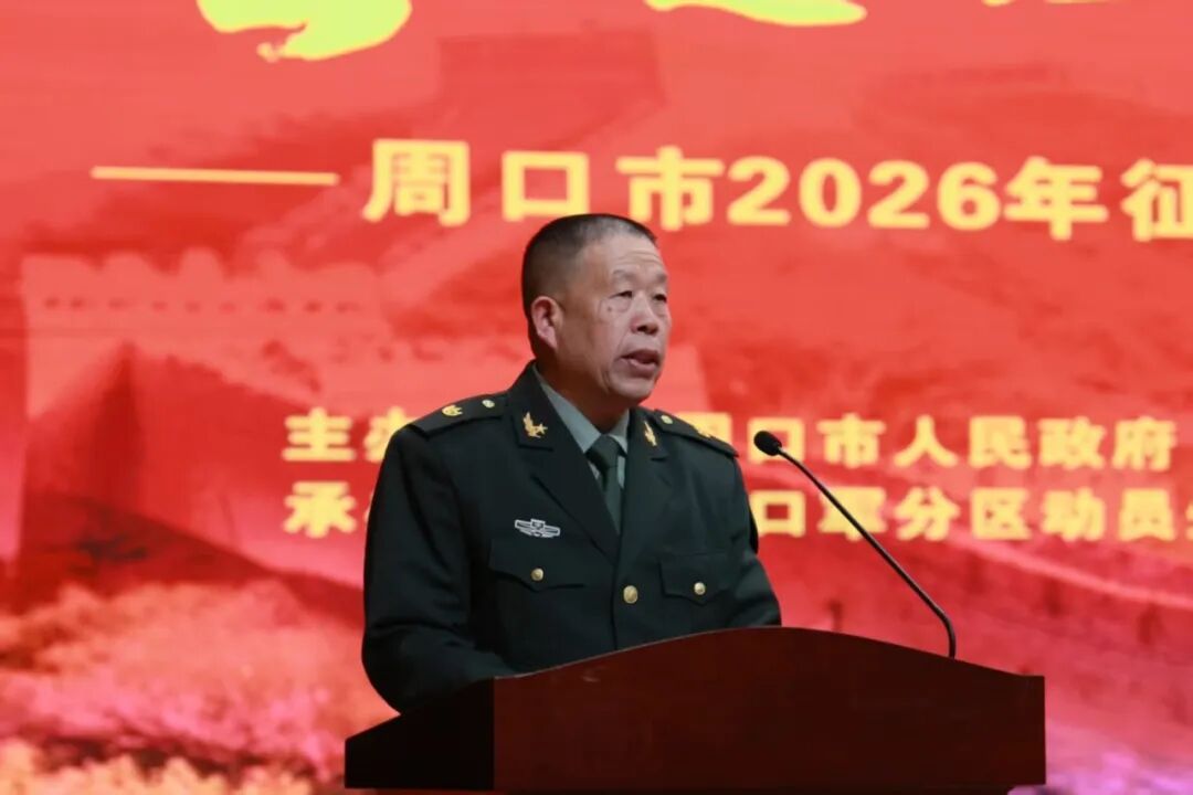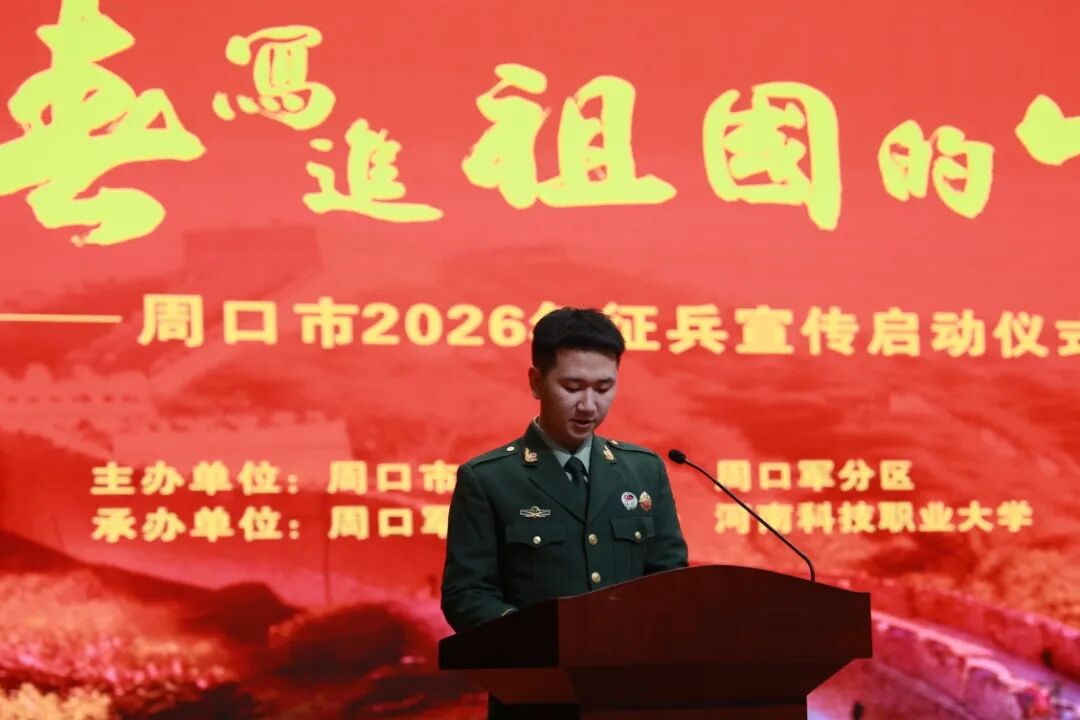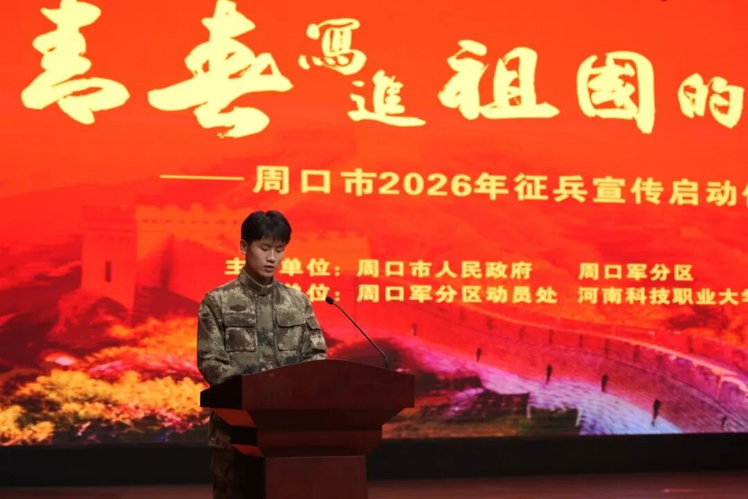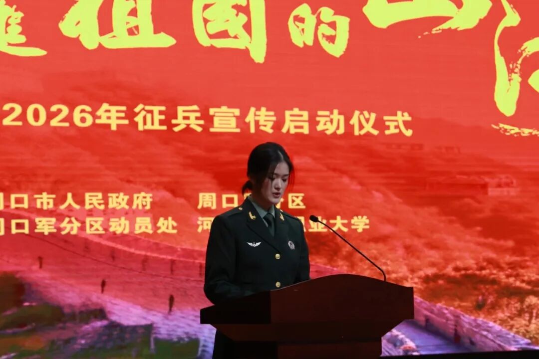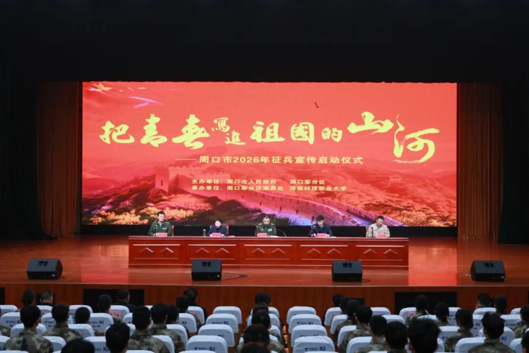 为深入贯彻习近平强军思想,扎实推进 2026 年大学生征兵工作,激发青年学子参军报国的热血豪情,12月18日上午,周口市 2026 年征兵宣传启动仪式在我校文体中心演播厅召开。市委常委、军分区大校司令员赵伯桥,市政府副市长、市公安局局长朱向阳,周口市第四届政协副主席、省人大代表、校长李海燕,军地有关领导出席活动,驻周各高校分管领导、武装部长、辅导员代表及我校师生代表共同参会。会议由赵伯桥主持。