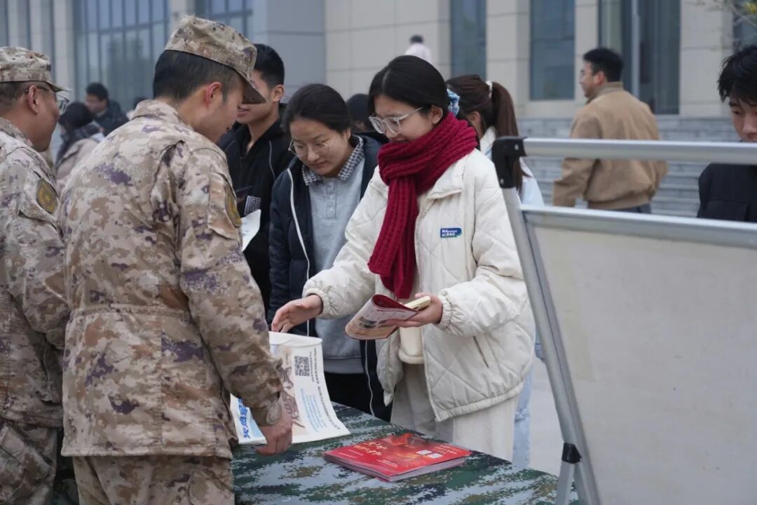 仪式尾声,市征兵办在校园内同步设立征兵政策咨询台,通过摆放宣传展板、发放宣传手册等形式,将征兵政策精准送到学生身边。