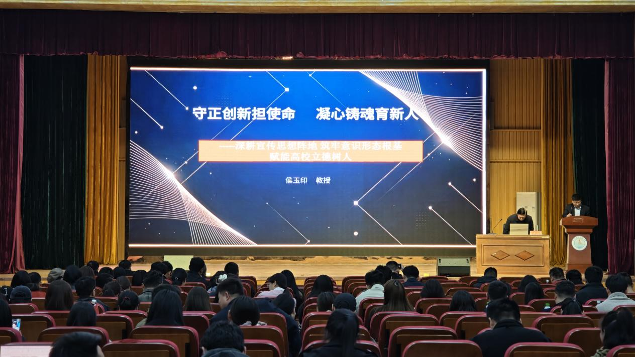 为深入学习贯彻习近平总书记关于宣传思想文化工作的重要论述,全面提升学校宣传思想文化和意识形态工作质效,4月8日下午,我校在图书馆三楼报告厅特邀侯玉印教授作题为《守正创新担使命凝心铸魂育新人》的专题辅导报告。校党委副书记夏永亮出席报告会,各处室负责人,各学院(部)党组织书记、副书记、党委宣传委员、团总支书记、学管办主任,各教师党支部书记,全体辅导员,以及学工部、宣传部、校团委、保卫处全体成员参会学习,报告会由夏永亮主持。