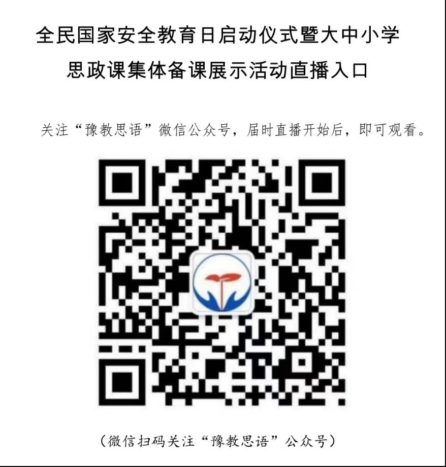 4月15日上午9:00-11:30,省委教育工委、省教育厅将在河南师范大学开展国家安全教育日启动仪式暨大中小学思政课集体备课展示活动。各党总支、直属党支部组织师生通过扫描二维码观看直播。