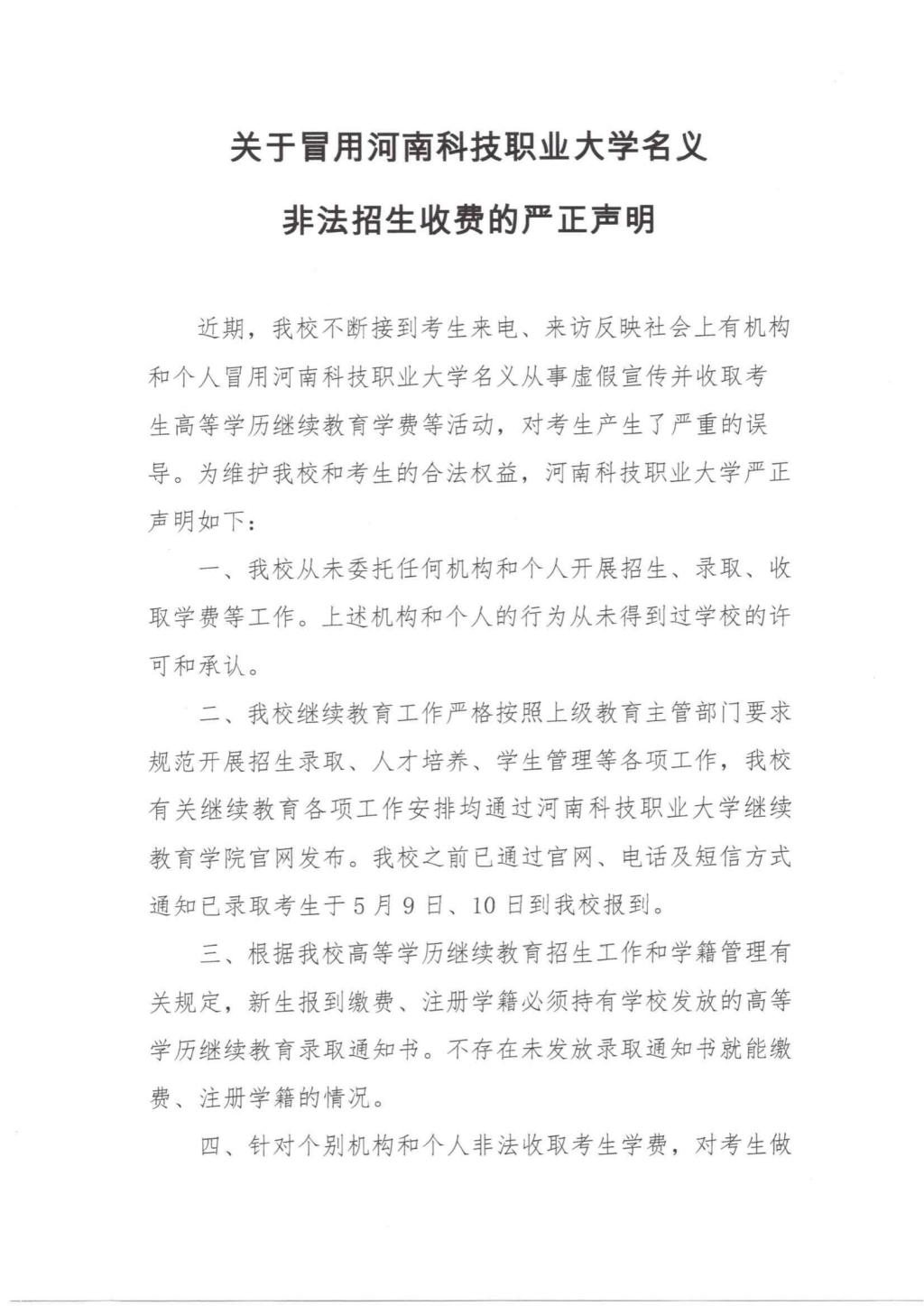 关于冒用河南科技职业大学名义非法招生收费的严正声明