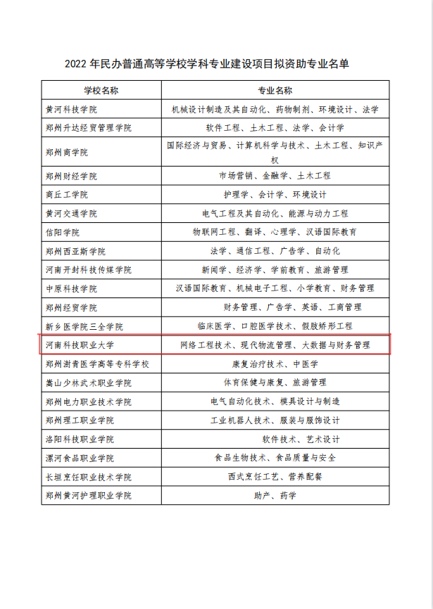 11月18日,河南省教育厅公布2022年民办普通高等学校学科专业建设项目拟资助专业名单,拟确定河南科技职业大学现代物流管理等21个高校62个专业为2022年民办普通高等学校学科专业建设资助项目。