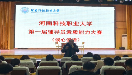 12月31日,河南科技职业大学第一届辅导员素质能力大赛决赛在图书馆三楼报告厅举行。校学工部、保卫处、校团委、心理健康中心等相关负责人担任比赛评委。各学院辅导员和学生代表参加此次活动。本次辅导员素质能力大赛共有三个环节,分别是基础知识测试、案例分析、谈心谈话环节。