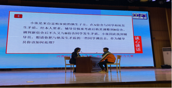 谈心谈话比赛环节,主要考察辅导员对相关理论政策、学生特征、学生成长成才规律的了解及对问题的解决能力和对学生的教育引导能力。比赛现场,辅导员与助演学生就情感困惑、家长干预校园矛盾冲突、宿舍人际关系等话题与事例展开谈心谈话,双方你来我往,处处智慧交锋、敏捷应对,将辅导员的日常工作场景生动、鲜活地再现。
