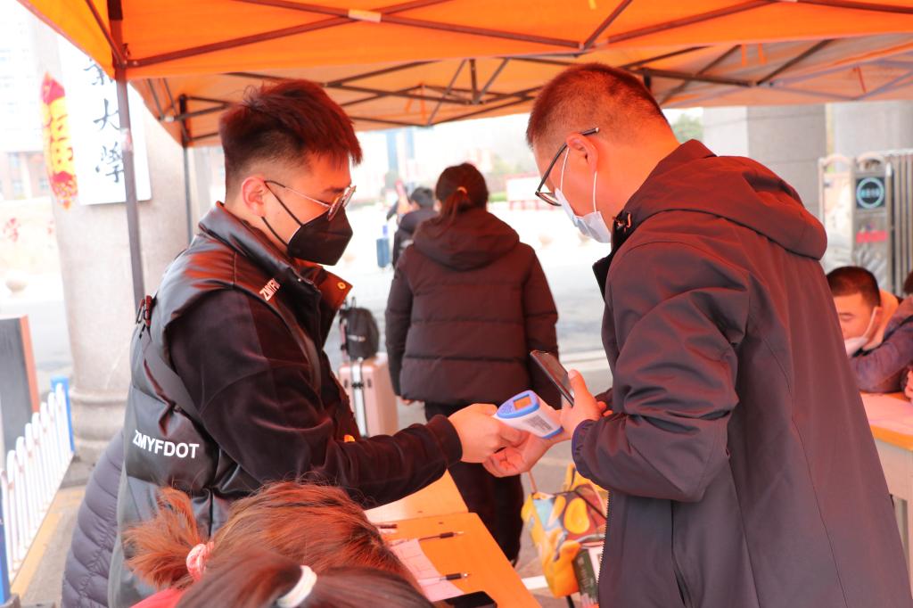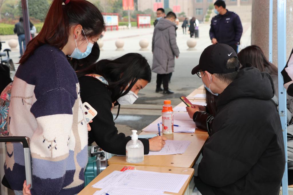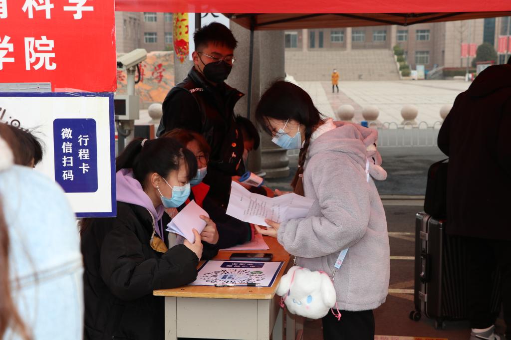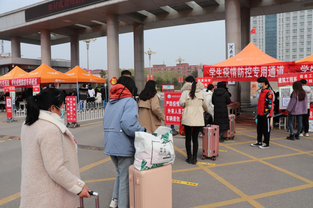 当第一缕晨光照耀在河南科技职业大学门前的广场上,从四方八面归来的莘莘学子已陆续抵达。学生们佩戴口罩,携带行李,在老师及志愿者的引导下,按照保持1米间隔依次通过安全检查通道,进行体温测量,个人及行李消毒,健康码、通行码及健康承诺书查验,信息登记等春季开学报到疫情防控流程,井然有序地进入校门。校领导与学生及家长热情地打招呼,学生干部帮助学生搬运行李,校卫队组织车辆秩序,使同学们一进校门就感到了家的温暖。他们的归来,使沉寂了一个假期的校园再次热闹起来。