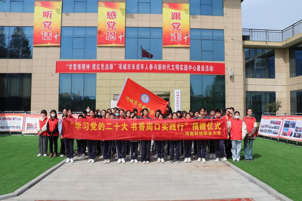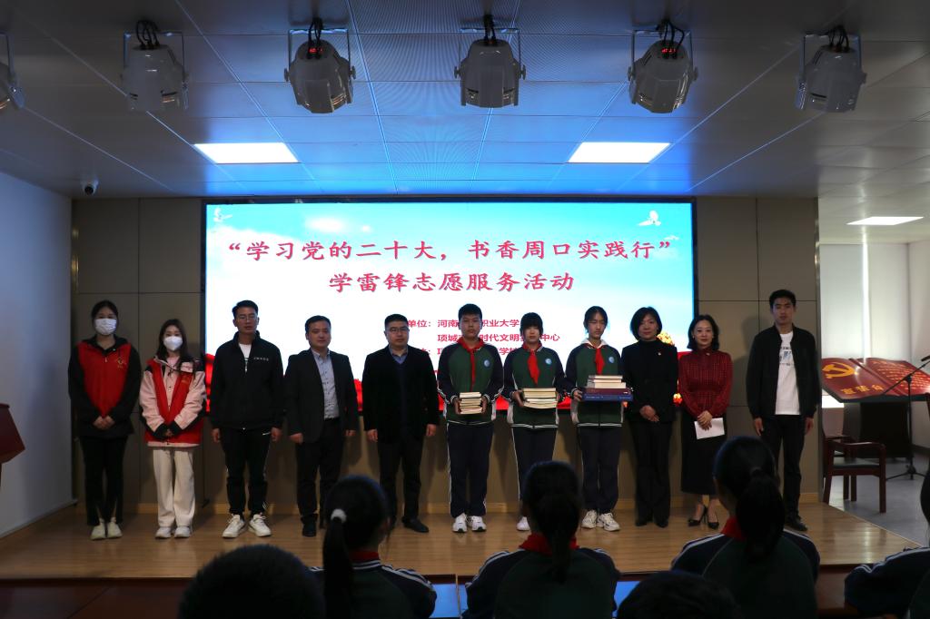 为深入开展学雷锋志愿服务,充分发挥高校在地方新时代文明实践中心建设中的积极作用,4月7日上午,我校党委宣传部副部长、团委书记孔建富,团委副书记王亚雷,教育科学学院团总支书记李思邈带领我校志愿服务总队10余名志愿者,来到项城市新时代文明实践中心开展“学习党的二十大,书香周口实践行”学雷锋志愿服务活动。项城市新时代文明实践中心主任刘娅,荣新路学校副校长龙晓静参加活动。