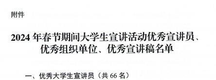 在中共周口市委宣传部举办的2024年春节期间大学生走进家乡开展特色宣讲活动的活动中,我校李逸晗等11名同学荣获优秀大学生宣讲员荣誉称号,我校被市委宣传部评为优秀组织单位,《传承中华优秀传统文化》等7篇文章被评为优秀宣讲稿。