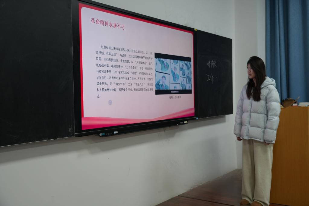 此次班会中,各班主持人通过讲解冬至节气的历史渊源、民俗传统与诗词典故,让同学们感受到了传统文化的智慧,感受中华传统文化的温度与魅力。同时,主持人结合长津湖战役史料,深情讲述志愿军战士在极寒环境中浴血奋战、保家卫国的英雄事迹。此外,通过历史图片展示、战地日记诵读、战役片段解析等形式,再现“冰雕连”的钢铁意志与赤胆忠心。